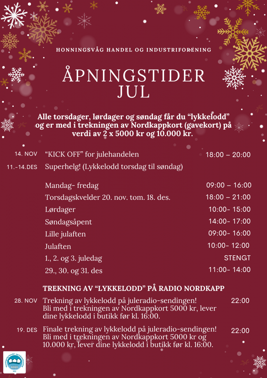 Åpningstider og programmet for førjulstiden og julen 2025, et program for Honningsvåg Handel og Industriforening. Denne siden blir oppdatert!