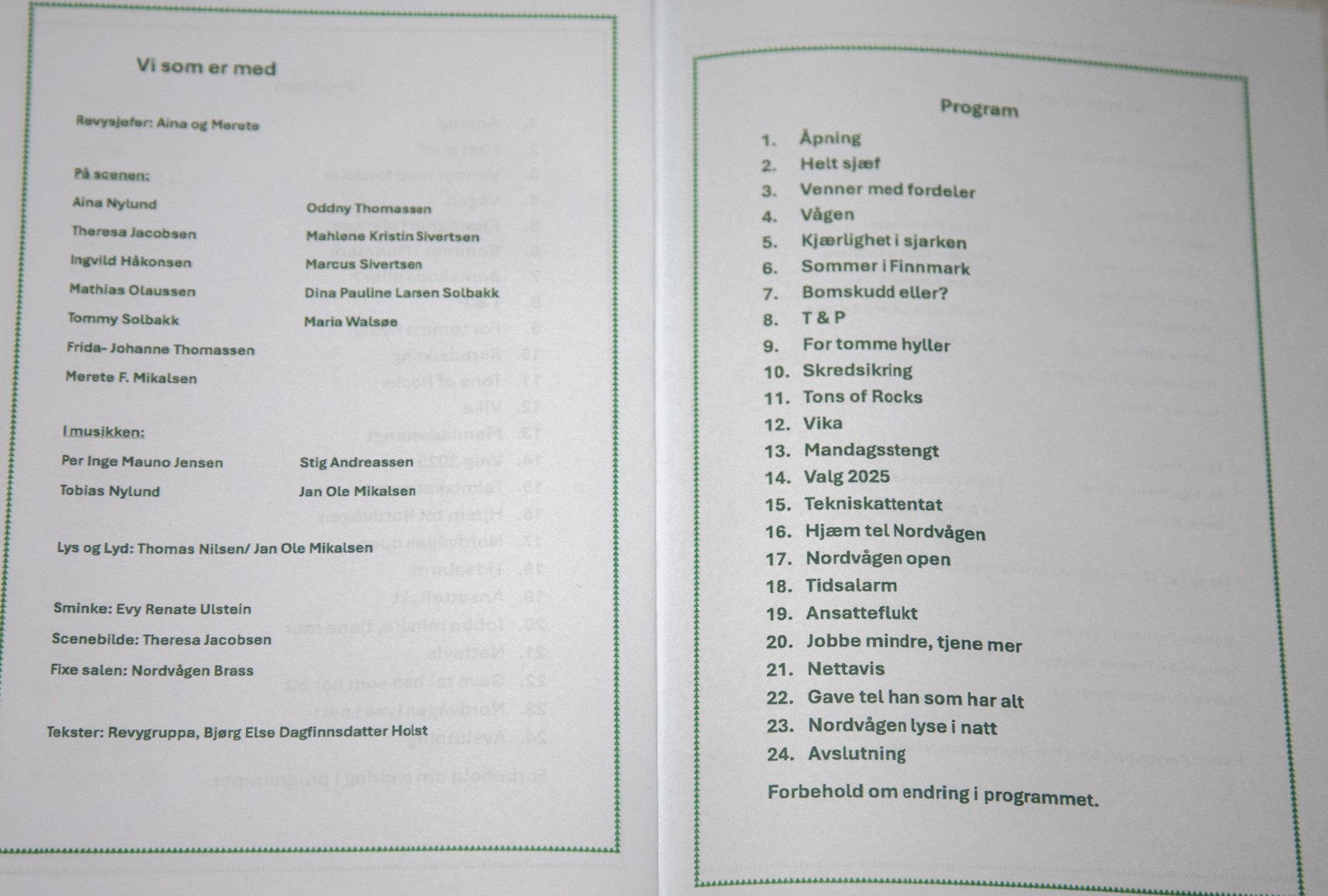 Nordvåg open er også i gang som dart-trening for å hindre at en Altaværing vinner Nordkapp open neste gang. Sangen Hjem te Nordvågen fikk trampeklapp noe flere nummer fikk. Helse Nord og Finnmarsposten som nettavis ble nevnt.