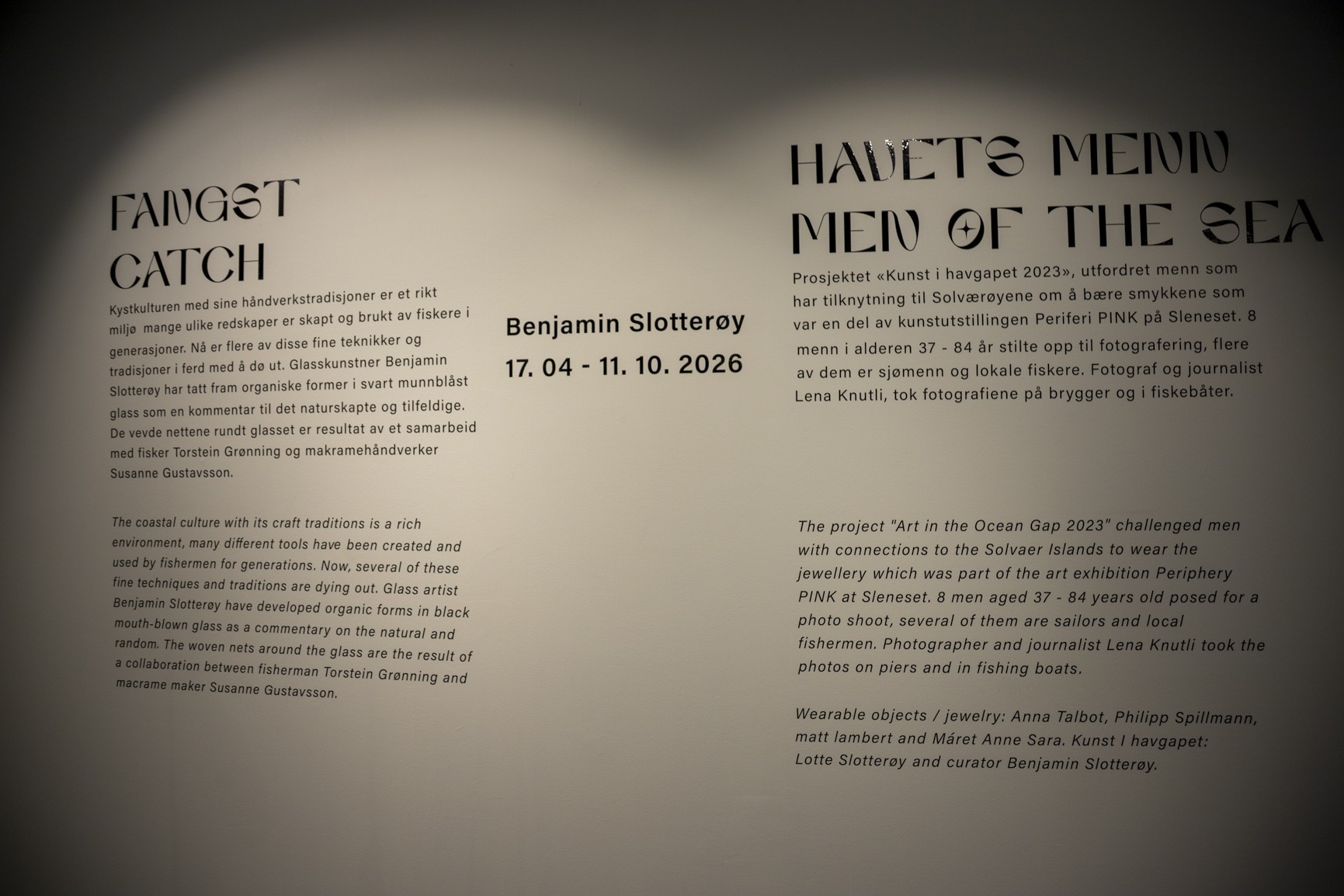 Kunstnere Benjamin Slotterøy har bakgrunn fra Helgelandskysten og har arbeidet med glass i over 20 år. I Honningsvåg presenterer han to prosjekter, glassinstallasjonen «Fangst» og fotoprosjektet «Havets menn».